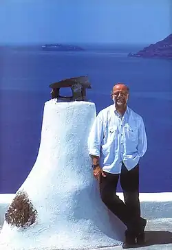 During the 1960s and 1970s, he drew inspiration from Greek and world cultural styles, which he developed for fashion in his textile patterns. His collections featured designs inspired by ancient Greek vases,[4] Byzantine manuscripts, traditional Greek wood carvings and paintings; African,[5] Chinese,[6] Indonesian, Russian,[7] and Spanish art; heraldry;[8] insects;[9] cartoons; Persian tapestries;[10] the Unicorn tapestries; and paintings by the Impressionists,[11][12] Dominicos Theotokopoulos (El Greco),[3]: 159–160 Henri Rousseau,[13] and Yannis Gaitis.[3]: 160–161