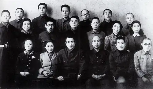 Nagata (front row, center left) in a January 1945 photo of the Sakura Corps that includes several members who died later that year at Hiroshima.