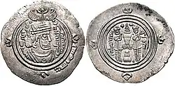 A Sasanian-style silver coin bearing the mint date as "Year I of Yazid" has been reported. The obverse side shows the portrait of the Sasanian king Khosrow II (r. 590–628) and his name in the Pahlavi script. The reverse has the usual Zoroastrian fire altar surrounded by attendants. The margins, however, contain the inscription that it was minted during the first year of Yazid's reign.[102] An anonymous coin from the Nishapur mint bearing the mint date 60, which is assumed to be the Hijri year, is also thought to be from Yazid's first regnal year.[103] Other coins from his reign usually have only the name of the governor of the province where the coin originated.[103][104] Coins bearing the name of the counter-caliph Abd Allah ibn al-Zubayr have also been found from the provinces of Fars and Kirman, dated between 61 and 63 (681–683 CE), although Ibn al-Zubayr did not publicly claim the caliphate until after the death of Yazid.[105] This may show that as well as the challenges to his rule in Arabia and Iraq, Yazid's authority was also challenged in southern Persia from roughly the time of his accession. The coins were probably minted in the name of Ibn al-Zubayr to lend legitimacy to the challengers of the Umayyads by using a suitable Qurayshite name.[106][i]
