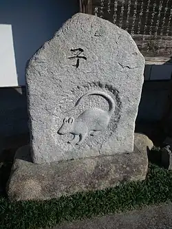 Stone monument with a carving of a mouse, at Mount Hôrai-ji Buddhist Temple, Aichi Prefecture, Japan, showing the (子) character designating the first of the twelve Earthly Branches