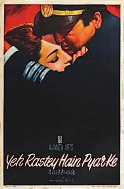 Yeh Rastey Hain Pyar Ke (lit. 'These are the paths of love') is a 1963 Hindi crime drama film starring Sunil Dutt and Leela Naidu in the lead roles. This film was Sunil Dutt's debut production, directed by R.K. Nayyar, with music composed by Ravi.[1] Dutt's favourite writer Aghajani Kashmiri scripted Yeh Rastey.. which is based on the sensational K.M. Nanavati adultery and murder case in Mumbai.[2] The film was said to be a thinly-disguised version of the famous Nanavati case where an upright naval captain, Capt. Nanavati, shot dead the lover of his wife. The film was said to be ahead of its times and too bold but did well at the box office.[3]