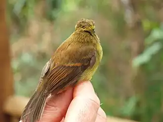 The yellow-bellied chat-tyrant has a complicated taxonomic history. It was formally described in 1843 as Myiobius diadema.[3] In 1966 Meyer de Schauensee placed the yellow-bellied chat-tyrant in genus Ochthoeca.[4] Wesley Lanyon moved it to Silvicultrix when he erected that genus in 1986.[5] In 2009 the IOC adopted the change in genus to Silvicultrix.[6] BirdLife International's Handbook of the Birds of the World (HBW) adopted the reassignment to Silvicultrix in 2016, the Clements taxonomy in 2022, and the South American Classification Committee of the American Ornithological Society (SACC) in 2023.[7][8][9]