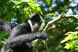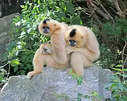 The yellow-cheeked gibbon (Nomascus gabriellae), also called the golden-cheeked gibbon, the yellow-cheeked crested gibbon, the golden-cheeked crested gibbon, the red-cheeked gibbon,[3] or the buffed-cheeked gibbon, is a species of gibbon native to Vietnam, Laos, and Cambodia.[3] The species was discovered and named after the British naturalist Gabrielle Maud Vassal.[4]