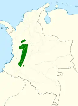 This bird was encountered in the La Plata Vieja Valley in Huila Department in 1967, but the only recent records are from the upper Coello River basin in Tolima Department (the Toché River is one of the main tributaries of the Coello River). Namely, it is found between 1,000 and 2,500 meters ASL in Cajamarca, Ibagué and Roncesvalles and perhaps Rovira municipalities, in the upper reaches of the Anaime, Cocora, Combeima and Toché river valleys.[4]