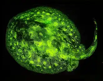 The yellow stingray exhibits biofluorescence, that is, when illuminated by blue or ultraviolet light, it re-emits it as green, and appears differently than under white light illumination. Biofluorescence potentially assists intraspecific communication and camouflage.[22]