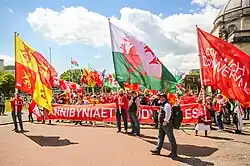 In May 2019 the group held the first Welsh independence march in Cardiff, in conjunction with organisers All Under One Banner Cymru.[55] The organisers claimed as many as 3,000 people attended the event and speakers included Plaid Cymru leader Adam Price, performer Carys Eleri, and Ben Gwalchmai of Labour for an independent Wales.[56]