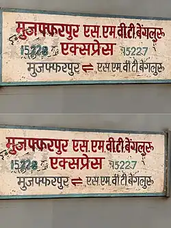 The Muzaffarpur–SMVT Bengaluru Weekly Express is an Express train belonging to East Central Railway zone that runs between Muzaffarpur Junction and Sir M. Visvesvaraya Terminal, Bengaluru in India. It is currently being operated with 15227/15228 train numbers on a weekly basis.[1][2][3][4]