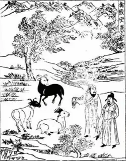 Written in Chinese, Yinshan zhengyao also contains several Arabic, Mongol, and Turkish loan words.[14] In total, the text includes 236 recipes and more than two hundred drawings, some of which are followed by written explanations.[2][4] One such drawing, found in the second juan,[5] is captioned "strange transformations in animals" (禽獸變異) and depicts a trio of black-and-white coloured goats. The author explains that "if one is not careful about what one eats, it will result in one becoming ill."[2] This is immediately accompanied by a list of animals that should not be consumed, such as a "white horse with green hooves", a "crab with only one claw", or a "sheep with a hole in its liver".[12]