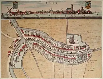It is not clear whether the city of IJlst gave its name to the Ylostins, or whether it was the other way around. The Harinxma thoe IJlst[1] family founded the Ylostins in the Middle Ages, probably around 1400.[2] After the family, the castle was also called Harinxmastins.[3] The Ylostins was on the south side of the city. Together with the church on the north side, it formed a defensible complex.[4] The owner of the Ylostins was also the “eeheer or olderman” of IJlst.[5] After the last Harinxma's passed away, the Ylostins came into the hands of local noble families such as Galama and Vegelin van Claerbergen, through inheritance and purchase and sale.