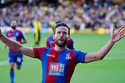 On 27 August 2016, Cabaye had his penalty saved by Artur Boruc, in an eventual 1–1 draw with AFC Bournemouth.[102] He scored his first goal of the season against Leicester City; the consolation goal in a 3–1 loss.[103] On 26 December, Cabaye opened the scoring in a 1–1 draw with Watford, the first match under new Palace manager Sam Allardyce.[104] After providing consecutive assists against Middlesbrough and West Bromwich Albion for the first time since April 2012, Cabaye ended a run of forty-seven Premier League matches without doing so.[105] On 1 July 2018, Cabaye was released by Crystal Palace following the conclusion of his contract.[106]