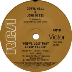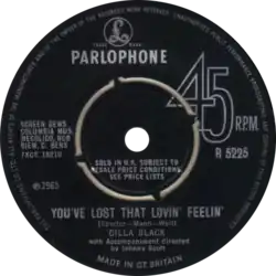 "You've Lost That Lovin' Feelin'" is a song by Phil Spector, Barry Mann, and Cynthia Weil, first recorded in 1964 by the American vocal duo the Righteous Brothers. This version, produced by Spector, is cited by some music critics as the ultimate expression and illustration of his Wall of Sound recording technique.[1] The record was a critical and commercial success on its release, reaching number one in early February 1965 in both the United States and the United Kingdom. The single ranked No. 5 in Billboard's year-end Top 100 of 1965 Hot 100 hits – based on combined airplay and sales, and not including three charted weeks in December 1964 – and has entered the UK Top Ten on three occasions.[2]