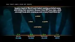 The majority of the game's dialogue is provided by Harry Gottlieb's brother Tom, who had voiced the emcee "Cookie" Masterson in the earlier games, and had been considered one of the more popular emcees by players.[3] Lacking any professional studio, most of the 100-200 hrs of game dialog were recorded in a makeshift soundproofed closet.[5] Tom Gottlieb was also involved in the writing process, as Jellyvision Games credits much of the "Cookie" persona to his own performance of the character.[3][7] Other sound effects include fake commercials that are heard before and after a game; some of these include commercials used in previous iterations of the You Don't Know Jack series.[7] Prior to each questions, the game includes short musical interstitials with animated numbers to introduce the question via its number. These were designed as to get the music for these stuck in the players' heads as something they would remember throughout the day; to avoid making these become too routine, certain episodes featured variations on the interstitial that would be unexpected, keeping players on their toes throughout playing the game.[3]