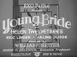 Young Bride is a 1932 American pre-Code drama film directed by William A. Seiter and written by Garrett Fort, Ralph Murphy and Jane Murfin. The film stars Helen Twelvetrees, Eric Linden, Arline Judge, Roscoe Ates and Polly Walters. The film was released on April 8, 1932, by RKO Pictures.[1][2][3]