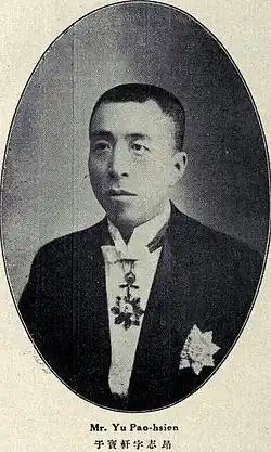 Yu Baoxuan (simplified Chinese: 于宝轩; traditional Chinese: 于寶軒; pinyin: Yú Bǎoxuān; Wade–Giles: Yü Pao-hsüan; born 1875) was a politician in the Republic of China. He was a member of the Anhui clique. Later he became an important politician during the Reformed Government of the Republic of China and the Wang Jingwei regime (Republic of China-Nanjing). His courtesy name was Zi'ang (子昂) or Zhi'ang (志昂). He was born in Jiangdu, Jiangsu.
