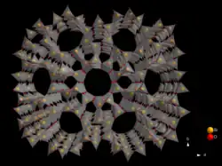 ZSM-5 is composed of several pentasil units linked together by oxygen bridges to form pentasil chains. A pentasil unit consists of eight five-membered rings. In these rings, the vertices are Al or Si and an O is assumed to be bonded between the vertices. The pentasil chains are interconnected by oxygen bridges to form corrugated sheets with 10-ring holes. Like the pentasil units, each 10-ring hole has Al or Si as vertices with an O assumed to be bonded between each vertex. Each corrugated sheet is connected by oxygen bridges to form a structure with "straight 10-ring channels running parallel to the corrugations and sinusoidal 10-ring channels perpendicular to the sheets."[2] Adjacent layers of the sheets are related by an inversion point. The estimated pore size of the channel running parallel with the corrugations is 5.4–5.6 Å.[3] The crystallographic unit cell of ZSM-5 has 96 T sites (Si or Al), 192 O sites, and a number of compensating cations depending on the Si/Al ratio, which ranges from 12 to infinity. The structure is orthorhombic (space group Pnma) at high temperatures, but a phase transition to the monoclinic space group P21/n.1.13 occurs on cooling below a transition temperature, located between 300 and 350 K.[4][5]
