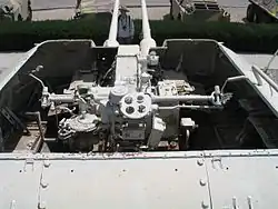 The ZSU-57-2 still retained some of the features of its predecessor, the ZSU-37. One of them was the lack of an armoured roof on the turret. The advantages of an open turret for SPAAGs, such as very high elevation angle for AA autocannons, excellent visibility of the combat situation by the gunners and no need for induced ventilation of the fighting compartment during intense fire were significantly over-shadowed by the disadvantages. The open turret of the ZSU-57-2 made it vulnerable from above, and prevented operations under NBC conditions.[15] This flaw was partially nullified in the modified Bosnian Serb ZSU-57-2s, which had improvised overhead armour protection.