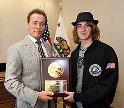 ![]() Zac Sunderland (right) with California Governor Arnold Schwarzenegger in August 2009 | |