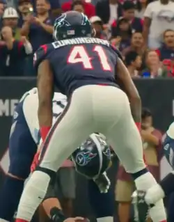 He made his professional regular season debut during the Texans' season-opening 29–7 loss to the Jaguars and finished the game with five combined tackle and a pass deflection. The following week, Cunningham earned his first career start and recorded six combined tackles as the Texans defeated the Cincinnati Bengals, 13–9. On October 8, 2017, he collected nine combined tackles and forced the first fumble of his career during a 42–34 loss to the Kansas City Chiefs.[21] In Week 13, Cunningham recorded four combined tackles and made his first career sack on Titans' quarterback Marcus Mariota in the Texans' 24–13 loss at the Tennessee Titans. In Week 17, he collected a season-high 12 combined tackles (four solo) during a 22–13 loss at the Indianapolis Colts. He finished his rookie season in 2017 with 90 combined tackles (45 solo), six pass deflections, and 1.5 sacks in 16 games and 13 starts.[22]