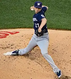 On July 31, 2015, the Orioles traded Davies to the Milwaukee Brewers for Gerardo Parra.[11] The Brewers assigned Davies to the Colorado Springs Sky Sox of the Triple–A Pacific Coast League,[4] with whom he was 1–2 with a 5.00 ERA,[12] and promoted him to make his major league debut on September 2.[13] In 2016 with Milwaukee, Davies pitched to a 3.97 ERA in 28 games. In 2017, Davies carried a 3.90 ERA in 33 games.