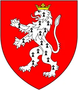 Surviving sources[14] do not enable Zachary Hamlyn's origins to be connected to the ancient Devonshire gentry family of Hamlyn of Widecombe and Buckfastleigh, resident at Widecombe in 1522 and still at Buckfastleigh in the late 19th century.[15] However, the arms of the Hamlyn family of Widecombe and Buckfastleigh (Gules, a lion rampant ermine crowned or),[16] appear on the monument to Zachary Hamlyn in Clovelly Church. The Hamlyn family is believed to have descended from Hamelin,[17] the Domesday Book tenant in 1086 of two manors (Alwington and Broad Hempston) under the Norman magnate Robert, Count of Mortain (d.1090),[18] half-brother of King William the Conqueror. He may have been the same Hamelin who also held two manors in Cornwall from the same overlord.[19] Sir John Hamlyn, of Larkbeare, in the parish of St Leonard, Exeter, father of Sir Osbert, was at the Battle of Bouroughbridge in 1322, and his arms are recorded on the roll of arms of the Knights present: Gules, a lion rampant ermine, crowned or.[20][21]