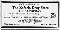 The area cites 1913 as its date of founding; by that time, the area contained numerous businesses and even a newspaper. It was one of a handful of "wet" cities in Los Angeles County in the 1910s.[5] By 1919 it supported several small factories and a jitney bus up and down Anaheim Avenue.[2] There was a domestic violence murder-suicide in front of "an electric train crew and passengers" at Zafaria station in 1919.[6] There was a Zaferia branch of the Long Beach Public Library at 3351 East Anaheim Street.[2] This branch was later known as either Zaferia or East Long Beach until the 1924 establishment of the "first East Long Beach branch building owned and built by the city" on Freeman Avenue.[3]