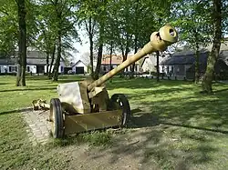 At the centre of the village green a cannon is positioned. This German anti-tank gun is of the type 7.5 cm PaK 40 and was used during World War II. It was used by the Germans to fire from the nearby village Wintelre in the direction of Oerle. The cannon was captured by the allied forces in September 1944 and put on the village green of Zandoerle during the liberation festivities of May 13, 1945. Some repairs were performed on the cannon in 1971. In 2006, the cannon was supposed to play a part in the movie Zwartboek of director Paul Verhoeven. However, this plan was cancelled as it turned out that the cannon was in a bad condition. It received repairs later that year.[4]