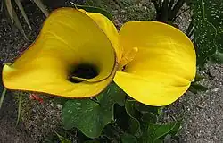 Zantedeschia jucunda, the Highveld golden arum, is a perennial, flowering plant and geophyte that is part of the Araceae family.[1] The species is endemic to Limpopo and occurs on the summit of the Leoloberge. The plant has an area of occurrence of less than 380 km2.[2] The plant is threatened by illegal collection by humans as well as mining and human activities.