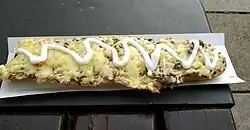 Oven-baked zapiekanki are available with additional ingredients and sauces, which has earned them the moniker of "Polish pizza".[3] Varieties include "diablo" with bacon, pickled cucumbers and spicy sauce; "Gypsy" with ham and sweet and sour sauce; "Greek" with olives and feta cheese; and "Hawaiian" with pineapple and barbecue sauce; patrons may also choose their own combinations. While the zapiekanka is primarily a street food, home-made versions also exist, such as the "student's zapiekanka", made from bread, cheese and whatever else is at hand at the moment.[4]