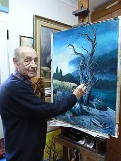 Once in Israel, Zeev Kun first settled at the kibbutz Givat-Haim near Hadera. He did not stay there for long, though, as in 1951 he became a student at the Akademie der bildenden Künste Wien Academy of Fine Arts in Vienna,[2] as the city had just witnessed the birth of the so-called Vienna School of Fantastic Realism. Students and young professors of the academy sought to reflect upon the tragedy of World War II, still maintaining a dialog with the masters of German Renaissance (such as Hieronymus Bosch and Pieter Bruegel the Elder), as well as the pioneers of surrealism of 1920s and 1930s, first of all Max Ernst (1891–1976). At the academy, Zeev Kun was close to Anton Lehmden (born in 1929) and Ernst Fuchs (1930–2015). In his art, the latter focused on the images of Apocalypse, creating paintings shot through with dread and fear of death. It is no wonder that Zeev Kun, who himself survived the nightmare of Auschwitz and Buchenwald, was so overwhelmed by the works of Fuchs, who happened to be his peer.[1] Upon his return to Israel, Zeev Kun joined the Israeli Painters and Sculptors Association. In 1973 he was awarded the Max Nordau Prize for Arts[3] and in 2023 – the Moshe Castel Prize for the outstanding contribution to the Israeli art.[4] His paintings have gained acclaim from art lovers in the Israeli non-Jewish sector, as well; they have been sold by their Alkara Art Gallery in Daliyat al-Karmel, Israel's largest Druze town.[5] Kun died on 20 June 2024, at the age of 94.[6]