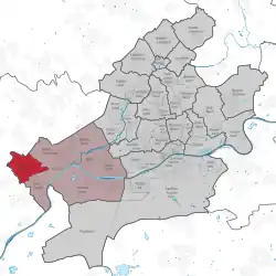 Location of Zeilsheim (red) and the Ortsbezirk West (light red) within Frankfurt am Main | |