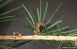 Zeiraphera griseana is a single-brooded species.[4] Adults are on wing in July depending on the location. Larvae live inside a tube-like spinning among the leaves.[2] They feed on the needles of Larix species (Larix gmelini and Larix decidua), Picea asperata, Abies fabri, Pinus sylvestris and Pinus cembra.[5]
