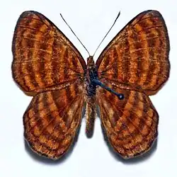 Zemeros emesoides is a midsized butterfly with coppery orange wings, characterized by orange and brown copper lines parallel to the margins. The underside wings have the same pattern.