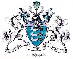 Coat of arms escutcheon depicts three leftwards facing, horizontally aligned silver knives with golden handles