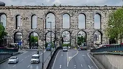 Framing the bazaar area are the remains of the Aqueduct of Valens, AKA as Bozdoğan Kemeri (Bozdoğan Aqueduct), constructed in 375 by the Emperor Valens reusing stones taken from ancient Chalcedon that used to exist on the site now filled by Kadıköy on the Asian side of the city. The aqueduct was used to bring water from Thrace (Trakya) into Constantinople for distribution around the city.