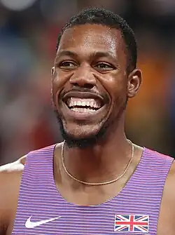 Zharnel Hughes (born 13 July 1995) is an Anguilla-born British sprinter who specialises in the 100 metres and 200 metres. Born and raised in the British Overseas Territory of Anguilla, he has competed internationally for Great Britain in the Olympic Games, World Athletics and European Athletics events, and for England at the Commonwealth Games, since 2015.[2] A double Commonwealth Games (2018, 2022), double European Championships (2018, 2022) gold medalist as part of the 4 × 100 metres relay, Hughes has twice been European champion individually; over 100 metres in 2018, and 200 metres in 2022. In 2023, he broke both British sprint records, before winning his first global individual medal, a bronze in the 100 metres at the 2023 World championships.