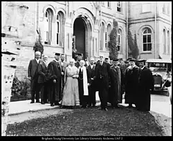 Like her mother, Brown valued education; she studied elocution and domestic science at Brigham Young College in Logan. In 1908 she married future LDS Apostle[15]: 472  Hugh B. Brown in the Salt Lake Temple.[16]: 395  She gave birth to eight children.[17]: 431  While Hugh was stationed in France during World War I, Brown managed his finances and survived the 1918 flu epidemic along with all of her children.[18]: 419  The elder Zina visited them in Canada as much as possible, and Brown in turn often visited her mother in Salt Lake City.[18]: 424  At the age of 48, Brown was called to serve in the British mission alongside her husband,[19] but fled England at the onset of World War II.[20]: 455  When it was safe to return to London after the war, she arranged for clothing to be sent from the church in Salt Lake City to help needy church members in London.[20]