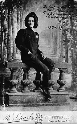 Nikolai Gippius's job entailed constant traveling, and because of this his daughters received little formal education. Taking lessons from governesses and visiting tutors, they attended schools sporadically in whatever city the family happened to stay for a significant period of time (Saratov, Tula and Kiev, among others).[5][6] At the age of 48 Nikolai Gippius died of tuberculosis,[7][8] and Anastasia Vasilyevna, knowing that all of her girls had inherited a predisposition to the illness that killed him, moved the family southwards, first to Yalta (where Zinaida had medical treatment) then in 1885 to Tiflis, closer to their uncle Alexander Stepanov's home.[9]