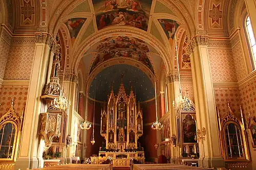 Built in the 19th century under the auspices of Cons. Peter Alois Bauer and Fruehmesser Alois Moriggl, the painter Franz Plattner decorated the entire interior with frescoes in vivid colours. This work occupied the master for a significant period of time. The frescos in the vault were created between 1862 and 1874. Remarkable as well are the abstract floral patterns that cover all the interior walls outside the frescos as well as the gilded pulpit.