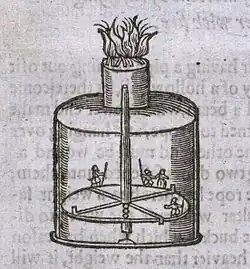 John Bate described a simple device in his 1634 book "The Mysteries of Nature and Art". It consisted of "a light Card, with severall images set upon it", fastened on the four spokes of a wheel, which was turned around by heat inside a glass or horn cylinder, "ſo that you would think the immages to bee living creatures by their motion".[6] The description seems rather close to a simple four-phase animation device depicted and described in Henry V. Hopwood's 1899 book Living Pictures (see picture). Hopwood gave no name, date or any additional information for this toy that rotated when blown upon.[7] A similar device inside a small zoetrope drum with four slits, was marketed around 1900 by a Parisian company as L'Animateur (or The Animator).[8] However, Bate's device as it is seen in the accompanying illustration seems not to have actually animated the images, but rather to have moved the images around spatially.