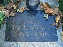 Zofia Licharewa was born in Tosno (Russia, St. Petersburg Governorate) into the family of a tsarist officer.[1] Her father, Alexei Likharev, was a major general. Mother, Maria Gruszecka, daughter of an engineering colonel, a graduate of the Pavlovsky Institute in St. Petersburg (1867), came from a Polish family. Zofia received a thorough home education. As the daughter of a major general, she participated in the coronation celebrations of Tsar Nicholas II. In 1904, Licharewa's father died and was buried in the Troitsky Sergeyevsky Orthodox Monastery in St. Petersburg.