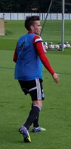 Stieber made his Hamburger SV debut on 30 August 2014, where he played 45 minutes, in a 3–0 loss against Paderborn.[66] In January 2015, Stieber played for the first time as a center in Hamburg against Eintracht Frankfurt in a friendly match.[67] On 4 February, he scored his first goal in the 2014–15 Bundesliga season in a 3–0 victory over Paderborn in the 91st minute at the Benteler Arena, Paderborn, Germany.[68][69] On 7 February 2015, he set the record of the highest distance in the 2014–15 Bundesliga by running 13.9 km against Hannover 96 at the Imtech-Arena, Hamburg.[70]