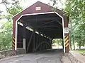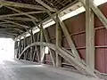 The bridge has a single span, wooden, double Burr arch trusses design with the addition of steel hanger rods. The deck is made from oak planks.[1] It is painted red, the traditional color of Lancaster County covered bridges, on both the inside and outside. Both approaches to the bridge are painted red with white trim.