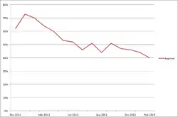 The government succeeded in reducing the budget deficit to 5.3% in 2012,[59] but GDP contracted by 2.2% and public debt reached 69.2%.[60][61] Milanović's time in office has been marked by several cuts to Croatia's credit rating. On 14 December 2012 S&P cut the country's long term rating to BB+ and the short term rating to B.[62] On 1 February 2013, Moody's cut Croatia's credit rating from Baa3 to Ba1.[62]
