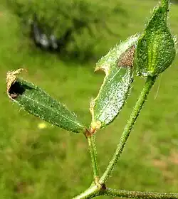 Zornia thymifolia is a much-branched perennial with slender stems with or without hairs. Its compound leaves consist of only two leaflets, each leaflet slenderly egg-shaped and up to 1.5 cm (3⁄5 in) long.[3]