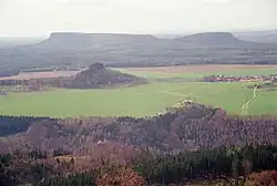 ![]() The Zschirnsteine. Left: Kleiner Zschirnstein, right: Großer Zschirnstein | |