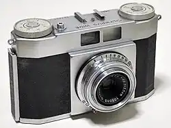 Using a chassis similar to the 35 V, Olympus also released the Olympus Wide in 1955, a viewfinder camera featuring the D.Zuiko-W 35mm f/3.5 wide-angle lens.[7]: 13 [11][12] A version of the Wide using the same lens was produced in 1957 with an integral uncoupled meter, branded the Wide-E.[7]: 14–15 [10] The Wide-E was sold in the United States as the Sears Tower 54.[13] In 1958, the Wide II viewfinder camera replaced the Wide with no change to the lens.[7]: 18