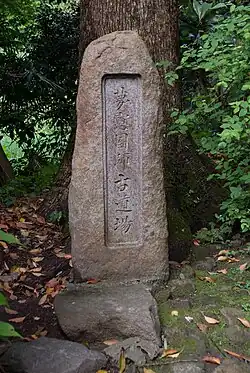 The narrow road that turns right before the ticket counter leads to a stele marking the spot where a temple called Yōan-ji (永安寺) used to stand.[1] It was there that fourth kubō Ashikaga Mochiuji, who had rebelled against the shogunate, in 1439 made his last stand against shōgun Ashikaga Yoshinori's forces, finally disemboweling himself to avoid the shame of being taken prisoner.[1] He is buried together with three other kubō in a small cemetery within Zuisen-ji (closed to the public).[1] The stele reads:[9]