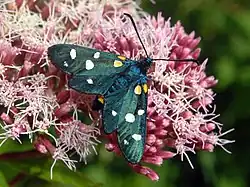 Amata phegea is another spotted moth species that looks similar to Z. ephialtes.[3][4] Because Z. ephialtes is unpalatable to other species, A. phegea takes advantage of this. Z. ephialtes is hyper-polymorphic, with two main forms- peucedanoid or ephialtoid. The peucedanoid form consists of a colored forewing and hindwing with spots. The ephialtoid form consists of all the forewing spots being white except the two basal spots, and the hindwings being black with a white spot. Either of these forms can be red or yellow. The yellow form has been found to be more advantageous than the red one.[3][4]