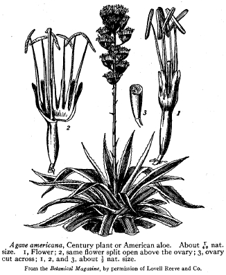 AGAVE, a large botanical genus of the natural order Amaryllidaceae, chiefly Mexican, but occurring also in the southern and western United States and in central and tropical South America. The plants have a large rosette of thick fleshy leaves generally ending in a sharp point and with a spiny margin; the stout stem is usually short, the leaves apparently springing from the root. They grow slowly and flower but once after a number of years, when a tall stem or “mast” grows from the centre of the leaf-rosette and bears a large number of shortly tubular flowers. After development of fruit the plant dies down, but suckers are frequently produced from the base of the stem which become new plants. The most familiar species is Agave americana (see fig.), a native of tropical America, the so-called century plant or American aloe (the maguey of Mexico). The number of years before flowering occurs depends on the vigour of the individual, the richness of the soil and the climate; during these years the plant is storing in its fleshy leaves the nourishment required for the effort of flowering. During the development of the inflorescence there is a rush of sap to the base of the young flower-stalk. In the case of A. americana and other species this is used by the Mexicans to make their national beverage, pulque; the flower shoot is cut out and the sap collected and subsequently fermented. By distillation a spirit called mescal is prepared. The leaves of several species yield fibre, as for instance, A. rigida var. sisalana, sisal hemp (q.v.), A. decipiens, false sisal hemp; A. americana is the source of pita fibre, and is used as a fibre plant in Mexico, the West Indies and southern Europe. The flowering stem of the last named, dried and cut in slices, forms natural razor strops, and the expressed juice of the leaves will lather in water like soap. In the Madras Presidency the plant is extensively used for hedges along railroads. Agave americana, century plant, was introduced into Europe about the middle of the 16th century and is now widely cultivated for its handsome appearance; in the variegated forms the leaf has a white or yellow marginal or central stripe from base to apex. As the leaves unfold from the centre of the rosette the impression of the marginal spines is very conspicuous on the still erect younger leaves. The plants are usually grown in tubs and put out in the summer months, but in the winter require to be protected from frost. They mature very slowly and die after flowering, but are easily propagated by the offsets from the base of the stem.