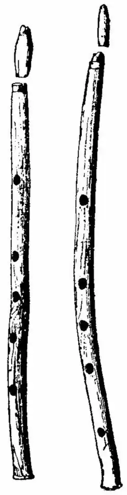 - ↑ Two Egyptian pipes now in the Louvre were found in a case ornamented with a painting of a female musician playing a double pipe. See E. de Rougé, Notice sommaire des monuments égyptiens exposés dans les galeries du Louvre, p. 87.